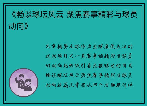 足球作为全球最受关注的运动项目之一,其赛事的精彩与球员的动向始终吸引着无数球迷的目光。《畅谈球坛风云 聚焦赛事精彩与球员动向》这篇文章将从四个方面进行详细阐述,分别是当前赛事的激烈竞争、球员转会市场的动向、未来足球的发展趋势以及球迷文化对足球的影响。通过对这些方面的深入分析,本文不仅为球迷们提供了对当前足球现状的全面了解,也探讨了未来足球发展的潜力与挑战。通过多维度的分析,本文将展示出球坛风云的多样性与复杂性,让读者能够全面把握足球世界的动态脉搏。